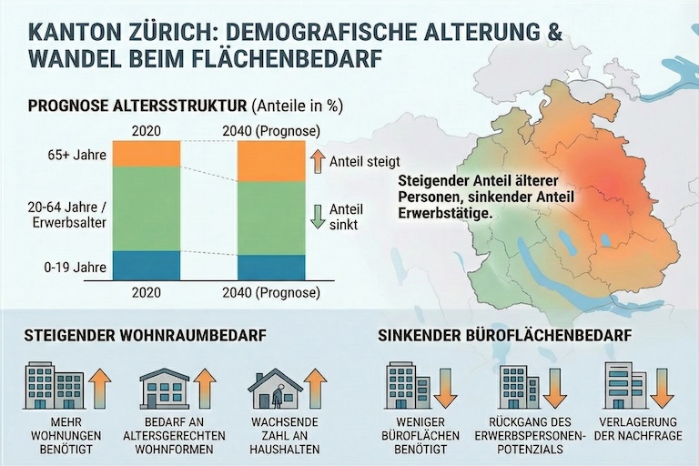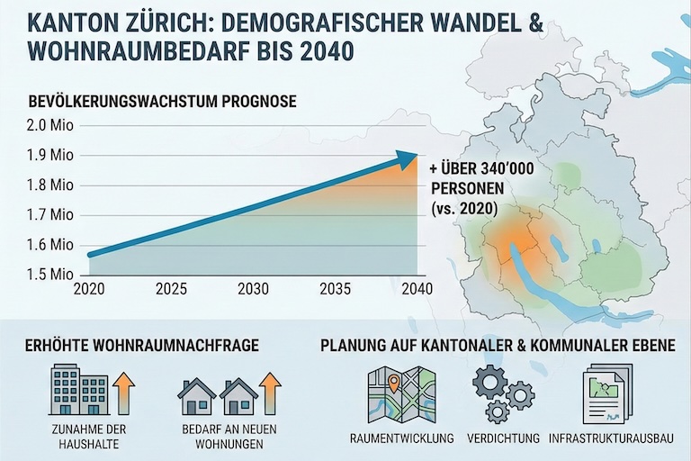 Der Kanton Zürich steht vor bedeutenden demografischen und wirtschaftlichen Veränderungen. Prognosen zufolge wird die Bevölkerung des Kantons Zürich bis 2040 um über 340’000 Personen wachsen. Dieses Wachstum führt zu einer erhöhten Nachfrage nach Wohnraum und erfordert eine entsprechende Planung auf kantonaler und kommunaler Ebene.
